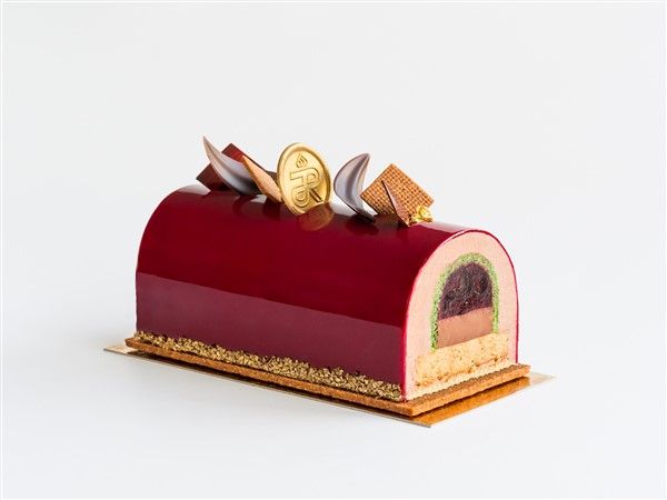 Pistache mousse, krokante pistache (Dubai), kersen-vanille crémeux, kersen compote, pistache biscuit en een pistache crumble.