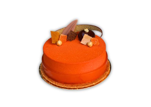 Praliné mousse, abrikozen-citrus compote, citrus crémeux, sacher biscuit, hazelnoot daquoise en een hazelnoot crumble.
